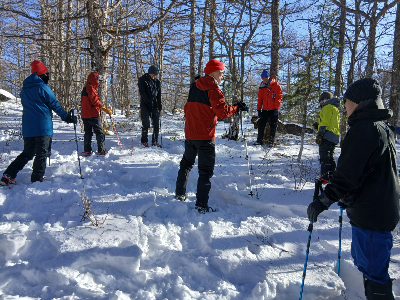 登山開始時は雪靴のみでの歩行である。事前に登山口での夏山とは違う雪靴歩行時の歩行法(キックステップ)の説明と実技があり、参加者は事前に班分けがなされていたそれぞれの班毎に登り始めた。最初こそ戸惑っている様子が見受けられたものの次第に歩き方がこなれてきた様子がうかがえた。登山道が急勾配になる前の開けた場所でアイゼン装着に変更。飯田支部長から登る際の「逆ハの字」歩行、下りの際は路に対して真っ直ぐに足を置くこと、急斜面を降りる場合は傾斜に対して斜めに下りること、アイゼンを引っ掛けないように両足の間に隙間をあけることなど歩行の基本説明があった。アイゼン装着時は飯田支部長のチェックを受けて出発。槍ヶ鞘手前の避難小屋からはストックをピッケルに持ち替えて更に歩行。槍ヶ鞘で写真撮影後、トーミの頭に向けて歩き出す。槍ヶ鞘からはこれまでの樹林帯から視界の正面に浅間山、遠方に富士山が見える絶景地点ではあるが、一方で登山道の片側が切れ落ちて、滑落の危険性もあることから緊張感を持って歩き出した。トーミの頭では班毎に写真撮影後、時間が押していたことからすぐに下山開始。ここで私は中道を下るところ、連絡を聞き間違えて槍ヶ鞘へ戻るルートを取ってしまった。参加者からの指摘で誤りに気が付き、改めて中コースへ戻って下ることになった。参加者及びスタッフサポーター各位には時間をロスし、負担をおかけした。お詫びしたい。またこの際に電波が通じず連絡がつかなかったこともあり、緊急時の対処に課題を残した。中道登山道下山後、登山口ではワカンを装着して周辺を歩くこととなった。短時間ではあったが初めての歩行を体験した参加者にとって雪靴やアイゼン歩行との違いを実感できたのではないかと思う。