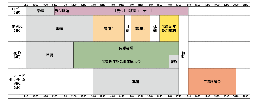 ※記念式典および年次晩餐会の受付は11時より開始します。受付を早めに済ませ、ネームプレートをお受け取りください。