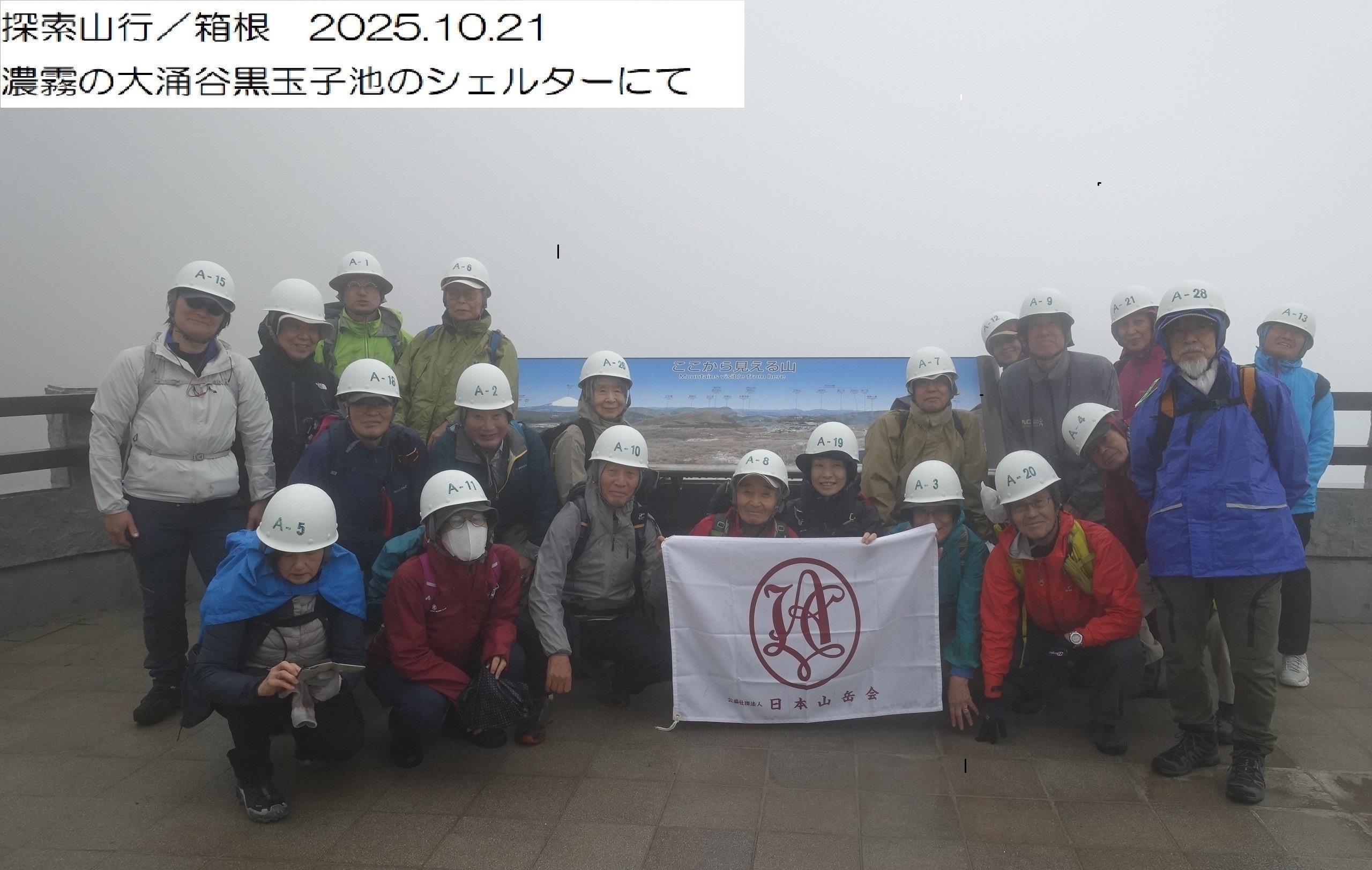 科学委員会主催の探索山行を10月20日(月)~21日(火)の2日間、箱根で開催した。参加者は科学委員14名、JAC会員5名、一般3名の22名であった。2日間にわたり、講師の神奈川県温泉地学研究所の萬年一剛研究課長から、専門の地質、火山関係について解説をいただいた。