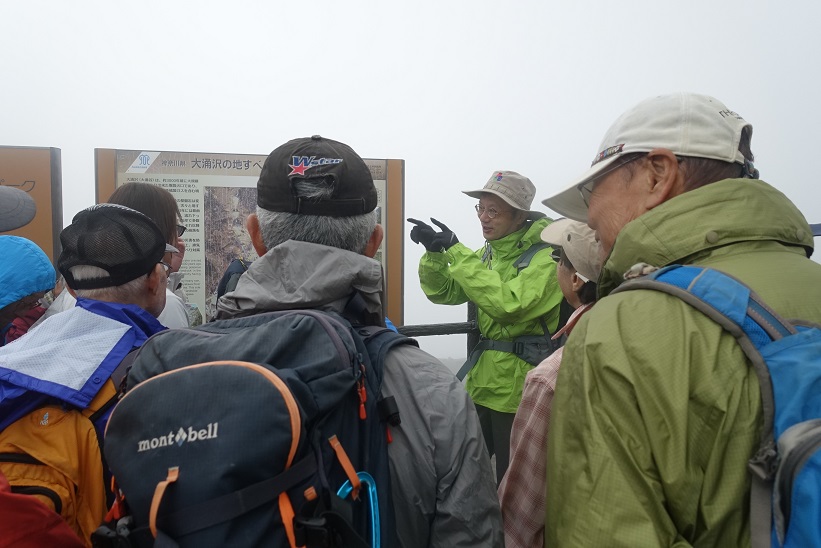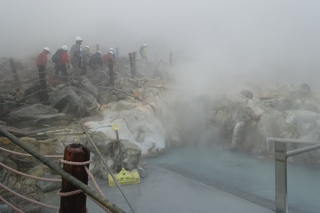 【2日目】萬年講師同行でロープウェイ大涌谷駅下車。大涌谷の噴気孔群のある谷を臨む展望台は濃霧。「ここまで見えないのは初めてだ」の講師のもと、蒸気井温泉の仕組、地すべり対策など大涌谷の火山活動について説明を受けた。その後「箱根ジオミュージアム」で火山と温泉に関する展示物の解説を受けた。なおここで、赤色立体地図の精緻な箱根全図展示を目にした。参加者皆、翌月の科学委員会主催のフォーラムでの発明者千葉達朗氏の講演に大いに関心が高まった。最後は昨夜セミナーで講義を聞いた、黒たまごを加工する噴気孔、湯たまりの見学である。火山活動で長らく閉鎖されていた大涌谷自然研究路の奥を目指す。全員ヘルメット着用で、講師と管理職員同行で研究路を15分ほど登る。たまご池を見学し、すぐ近くの非常時用シェルター屋上で、相変わらずの霧の中、足元の火山地帯を想像しながらの聴講であった。その後、計画では芦ノ湖西側の外輪山上の道路を箱根峠まで移動し中央火口丘を観察する予定だったが濃霧のため取りやめた。芦ノ湖畔経由で「森のふれあい館」に立ち寄り、箱根の動植物の標本や生体展示などを見学し、出発地の小田原へ降りた。途中、萬年講師の「温泉地学研究所」を視察見学する計画だったが諸事情でかなわす残念だった。あいにくの天候だったが、周りが真っ白で見えない分、講師の話は耳に響き新たな発見に出会った。心に残る箱根の秋日となった。(木曽雅昭)