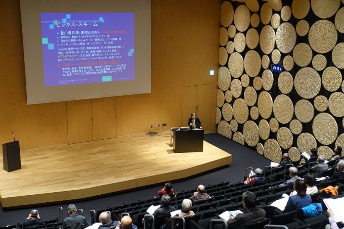 講演2では、「新しい登山形式の試みと将来ビジョン」と題して、南信州山岳文化伝統の会及び日本山岳会の大蔵喜福氏から斬新な報告がされた。だれでもが楽しめる「エコ登山」を目指して南アルプス南部・遠山郷を根拠地に、地域の活性化と観光登山の実践例が紹介された。「エコ登山」では「自然を学ぶ姿勢」を養ってほしいとの願いから、レンタルテントによる常設テント場、排泄物は携帯トイレによる持ち帰り、登山者の背負う荷物の軽減などにより、高齢者にも楽に登山ができることを可能とした。最終的にはビジターハウス、登山者の利便性の向上により、世界中からのインバウンド登山者、子供から高齢者を含む一般登山愛好家に、満足のいく登山を楽しんでもらうための登山基地構想が提示された。