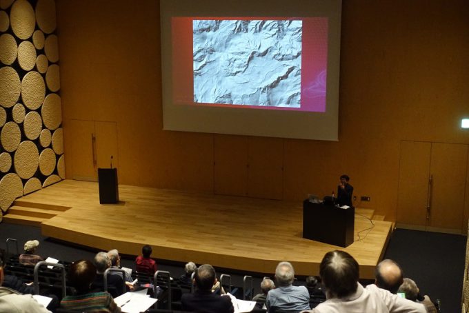 講演3では、「赤色立体地図 1枚で立体的に見える地形表現の活利用」と題して、立体赤色地図発明者でアジア航測株式会社フェローの千葉達朗氏から詳細な発明の経緯が報告された。富士山青木ヶ原の航空レーザ測量後の地形表現検討のなかで、方向依存性のない立体感を1枚の画像で実現する新しい表現法「赤色立体地図」を発案し、その興味深い応用事例が数多く紹介された。従来の地形可視化手法の問題点を改善し、尾根谷度を明度に、傾斜を彩度に対応させることで、陰影を用いずに地形の凸凹を表現することができ、尾根は明るく、谷は暗く、傾斜が大きいほど赤の彩度が強まる原理により、方向依存性のない安定した立体感が得られることを示した。その結果、樹木に覆われた青木ヶ原の火口列や側火山、古道・登山道の明瞭化、地殻変動の解析などに応用されている。今後は地形学・防災・考古学・教育などの多方面の応用が期待されている。