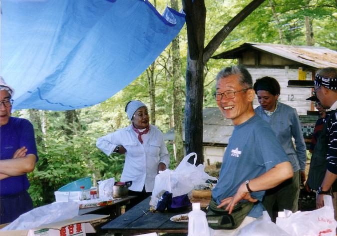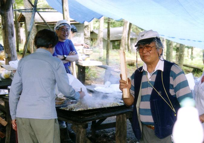 キャンプ場の炊事場はわれわれの貸切状態で、明るいうちは屋外のテーブルで宴会。暗くなってからはバンガローに移ってまた宴会。応援に来られた地元の芦川さんが刺身、天ぷら、にぎり寿司などを用意して下さったので、食べきれないほどのご馳走になってしまった。山の中でのにぎり寿司にはちょっと妙な気分だ。二次会は深更まで続いた。