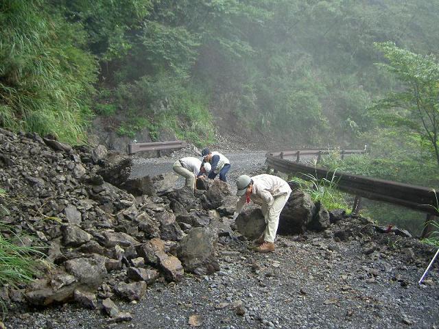 五樽沢のコルに下り三合山に登り返す、白ヤシオの群生帯で5〜6月が見頃らしい。途中野鳥のさえずりを聞く。三合山から京丸ボタンで有名な京丸山への道をわけ,高塚山に向かう。平坦な道を行き、やがてゆるい登りとなり高塚山頂に。変わった多くの立ち枯れを見る。コバイケソウの群落とのこと。日本山岳会編日本300名山高塚山の山名表示をバックに一同写真を撮り、大休止。幸い雨も降らず下山は来た道を戻り途中の五樽沢コルから南赤石林道登山口にでる。付近はカエデ、ミズナラ、ブナ、ヒメシャラの広葉樹とモミ、ツガ等の針葉樹林も多く紅葉も充分期待できる。山犬段/休憩舎に1時前に着く。休憩舎には登山者の2台の車もなく、空模様から下山したようだ。軽く昼食をとり荷物整理、小屋の清掃後出発する。昨夜来の雨で林道も小さな岩が落ち慎重に下る。突然前方に岩石が道を封鎖、一同唖然とする。20m上部から大岩が落下200キロ程の岩に粉砕された模様。所々で砂が落ちてあまり時間もたっていない。山崎さんが携帯で役場と連絡をとるも休みで連絡不能、思案の末落石の見張りを頼み、男性3人で撤去にかかる、3人がかりでやっと動く岩を必死に移動し、なんとか通れる道を確保できた。男性1人であればどうなっていたか、下山できる事に安堵する。