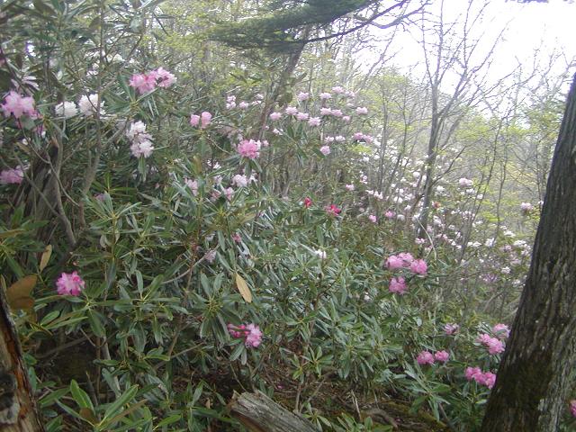 狭い頂上は溢れんばかりの人、やっと、座るところを見つけて昼食。雲低く依然として展望はなし。記念写真のあと小島さんを先頭に樹林の中を急下降する。急下降はもっとも苦手としているのでゆっくり歩くためうしろから3番目につく。一番後ろでは遅れて離されたときに焦って転ぶ可能性があるので経験から割り出した位置である。八反張のコルと呼ばれる鞍部は両側からの崩壊が進んでいるので通行は危険と聞いていたが、クサリが張ってあったのでそれほどのことはなかった。ただ、通過した後振り返ってみれば高度感があり下りの通過は緊張するかもしれない。枯れ木がめだつやせ尾根を登ると一等三角点のある前袈裟山頂に出る。途中、シャクナゲが良かった。花も良いが景色が良い。構図が良い。花はきれいだけでもだめで取り合わせが必要である。