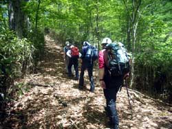 定刻全員集合。天気は快晴。すぐにタクシーに乗り、柳沢峠を越え一之瀬高橋先の山道入口で降りる。浅い緑が目に映えて爽やかだ。ミズナラが多い。林床はスズタケだが刈払いが行なわれているので歩き易い。道には時々フモトスミレなどが咲いている。