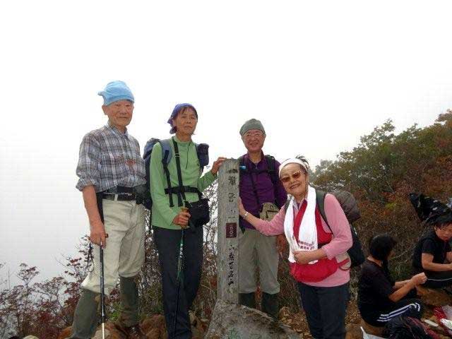 狭い山頂には数人の登山者がいたが、なんとかランチスペースをとる。生憎南面は雲に覆われて視界なし、北面の三ツ峠方面が雲の上に姿を表わしていた。