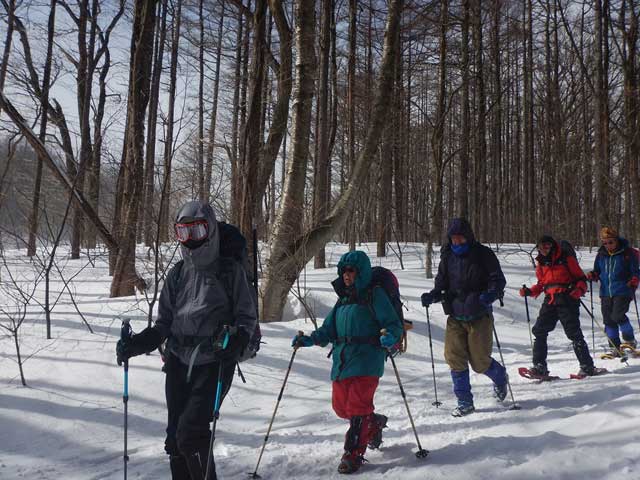 二本松駅に全員集合。駅前から予約したジャンボTAXに乗って冬枯れの野ずらを奥岳スキー場へ。いつものレストハウスで身支度をし、スキー場の脇から冬山初めてのユースクラブの二人を真ん中に夏道と同じ登山道を進む。ようやく勢至平の入り口辿り着く。