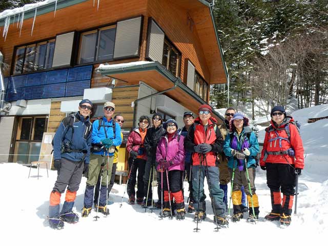 夏沢鉱泉で昼食を済ませ、根石岳へ出発。と、突然メンバーのアイゼンが外れてしまった。そこで第1班と第2班に分かれて行動開始。以下、第1班の行動内容となる。登山道はトレースがついており、ほぼ夏道のコースタイムでオーレン小屋に到着。小屋の前で小休止を取り、箕冠山へ向かって樹林帯を登りあげていく。