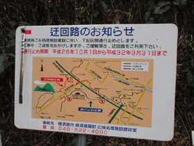 横浜横須賀道路をくぐるとやっと登山道らしくなった。小暗い道を小川に架かった橋を何度か渡る。 (後で調べたところ三浦半島最長の川で久里浜/浦賀水道へそそぐ「平作川」であった。同じ橋が確認できた) 沢沿いにはスコップなどの工事・補修用具がおかれ、目立たないようだが人の手が入っているようだ。 階段状の道が続き、高度をかせいでいる。