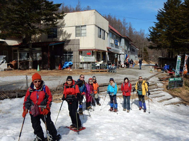 富士見駅に三々五々集合。駅前10:00発予定の送迎バスは定刻より早く出発。満員の送迎バスに乗り込んで富士見パノラマリゾートのゴンドラ駅へ向かう。ゴンドラ山頂駅へは予定の11:00より30分早く到着。 ところが何と登山口から雪がない。雪がないのでスノーシュー・アイゼンは付けず出発するが、樹林に入るとかちんかちんに凍結していて、油断するとすってんころりん。 樹林の中でスノーシュー・アイゼン等を装着する。入笠山湿原の木道は雪が全く付かず完全に露出してあっけにとられる。車道に出て雪道を拾いながら、マナスル山荘へ。 ここで右ひじ骨折治療中の松島が山頂へ向かう本隊と別れる。(松島記) |