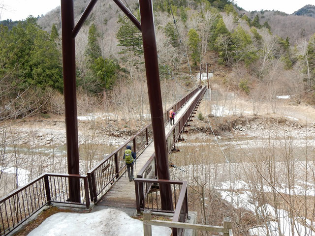 ゲートの閉まった奥鬼怒スーパー林道からいきなり階段を登り、小さな峠を越えて再び沢に下ると長い橋があった。「鬼怒の中将乙姫橋」という名の新しくできた橋である。橋を渡ると猿が1匹河原を歩いていた。